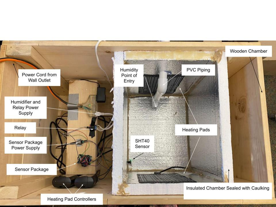 Developed a chamber with temperature and humidity control using commercial, off-the-shelf (COTS) components. Procured and tested reliable and repeatable sensors for temperature and humidity measurements. Procured and tested repeatable temperature and humidity control systems such as humidifiers and heaters. Designed the system to record temperature and humidity measurements at various intervals during tests and integrated induction charging for testing sample systems within the chamber.